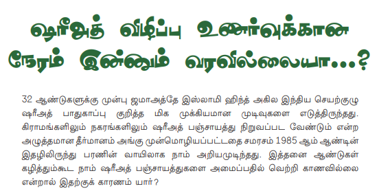 இந்தியா போன்ற பன்மைச் சமூகத்தில் ஷரீஅத் அடிப்படையிலான நடைமுறைகள் உயிர்பெறும் போது இஸ்லாத்தின் மீதான தேட்டமும் மதிப்பீடும் பலமடங்கு உயரும். ஏனென்றால் ஷரீஅத் சட்டத்தின் மூலமே இந்த மண்ணில் நீதியையும், அமைதியையும் நிலைநாட்ட முடியும். நடைமுறை வாழ்வில் கடைப்பிடிக்காமல் "ஷரீஅத் சட்டம் என்றால் என்ன?'என்பதை நாம் எத்தனை உரத்து முழங்கினாலும் மக்களிடம் அது எந்தவித தாக்கத்தையும் ஏற்படுத்தாது. ஷரீஅத் சட்டத்தை நாம் செயல்வடிவில் மக்களிடம் கொண்டு சேர்க்க வேண்டும். அத்தகைய தலையாய பொறுப்பு இன்றைய முஸ்லிம் சமுதாயத்திற்கு இருக்கிறது. ஷரீஅத் விசயத்தில் உணர்வுகளுக்கு நாம் முக்கியத்துவம் கொடுப்பதை விட பிரச்னைகளை உணர்ந்து கொள்வதற்குக் கொடுக்க வேண்டும். ஏனென்றால் ஷரீஅத் முஸ்லிம்களின் இறைநம்பிக்கை சார்ந்தது. அதனைப் பாதுகாப்பது முஸ்லிம்களின் கடமை. ஷரீஅத் சட்டத்தைப் பாதுகாப்பது என்பது அந்தச் சட்டத்திற்கு ஆதரவாகப் பதிவிடுவதும், கையெழுத்திடுவதும், குரல் கொடுப்பதும் மாத்திரம் அல்ல. அதனை நடைமுறைப்படுத்துவதுதான் அதனைப் பாதுகாக்கும் முதன்மை ஏற்பாடு. ஜமாஅத்தே இஸ்லாமி ஹிந்த் அகில இந்திய அளவில் முஸ்லிம் தனியார் சட்டம் குறித்த விழிப்பு உணர்வை ஏற்படுத்தவும், ஷரீஅத் குறித்த தெளிவையும், விழிப்பு உணர்வை ஏற்படுத்தவும் ஏப்ரல் மாதம் 23 முதல் மே மாதம் 7 ஆம் நாள் வரை அகில இந்திய அளவில் ஷரீஅத் விழிப்பு உணர்வு பரப்புரை நடத்த உள்ளது. இது ஜமாஅத்தே இஸ்லாமி இயக்கத்திற்கான பரப்புரை அல்ல...! இது ஷரீஅத் குறித்த பரப்புரை. இது நமக்குக் காலம் தந்த வாய்ப்பு. வேறுபாடுகள் மறந்து, நமது உயிர் மூச்சான ஷரீஅத் சட்டத்தைப் பாதுகாக்கும் முயற்சியாக இந்தப் பரப்புரையில் நாம் அனைவரும் ஒன்றிணைந்து களமிறங்குவோம். உலகை வழி நடத்திச் செல்வோம்.